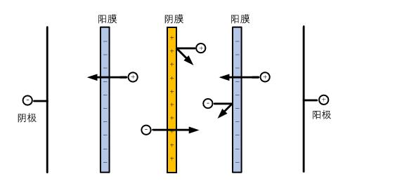 分為電滲析陰膜和電滲析陽膜兩種,陰膜具有透過陰離子而阻擋陽離子的特性,陽膜具有透過陽離子而阻擋陰離子的特性。將陰膜和陽膜交替排布,在直流電場(chǎng)的作用下,可實(shí)現(xiàn)鹽分的遷移,從而實(shí)現(xiàn)鹽分的脫除或濃縮。