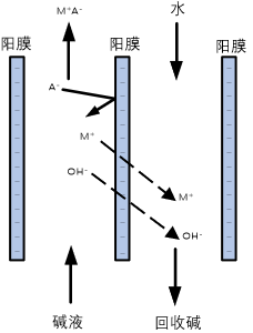 堿回收擴(kuò)散滲析過程以濃差為驅(qū)動(dòng)力,利用陽離子交換膜對(duì)堿的選擇透過性和對(duì)鹽或其它組分的高截留性,實(shí)現(xiàn)溶液中堿與鹽或其它組分的分離,分離出的堿溶液回用于生產(chǎn)工藝。
