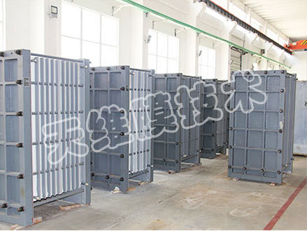 將擴(kuò)散滲析陽膜、滲析室隔板以及擴(kuò)散室隔板按一定順序排列起來,在兩側(cè)放置配水板并用夾緊板夾緊的分離堿的設(shè)備。