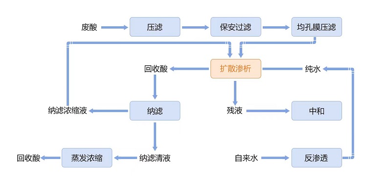 該項目以擴散滲析技術為核心,將微濾、擴散滲析和納濾等過程耦合。采用微濾工藝作為預處理,采用山東天維膜技術有限公司自主研發(fā)的高性能擴散滲析膜實現硫酸回收并除去亞鐵離子,采用納濾工藝實現亞鐵離子的拋光處理,最終實現鈦白粉副產廢硫酸的資源化回收利用。