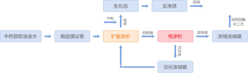 中藥提取液廢水經陶瓷膜過濾后進入擴散滲析器處理,擴散滲析殘液外排至生化處理系統進行生化處理,生化達標水經反滲透過濾產生純水回用;擴散滲析回收酸(硫酸含量約3%)進入均相膜電滲析器濃縮淡化,淡水可作為擴散滲析接收液回用,濃水濃縮至硫酸含量9%以上回用到中藥提取液生產工藝。通過膜集成技術配合傳統生化工藝,使該中藥提取液廢水得以資源化利用。