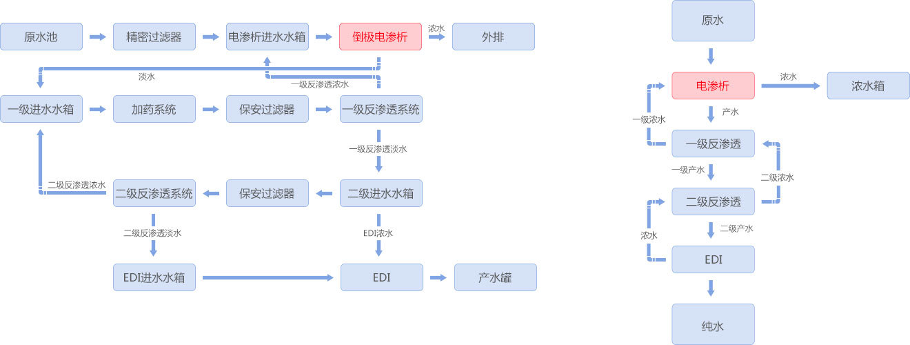 熱電廠反滲透濃水經電滲析處理到鍋爐用水標準。反滲透濃水電導率3700μS/cm,水量150m3/h,經電滲析處理后,電滲析濃水出水26m3/h,含鹽量11118mg/L。進一步,電滲析淡水進入反滲透系統,反滲透淡水進一步經EDI處理為鍋爐用水,EDI產水電導率≤0.2μS/cm,pH值7±1。